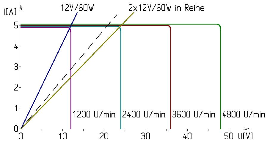 Außer den Kennlinien der Lichtspule bei 1200, 2400, 3600 und 4800 Umdrehungen pro Minute ist die Kennlinie einer Glühlampe 12 V/60 W dargestellt, hier vereinfacht als ohmscher Wiederstand (eigentlich müsste sie gekrümmt dargestellt werden, da eine Glühlampe ein Kaltleiter ist). Unabhängig von der Drehzahl schneiden sich die Kennlinien von Lichtspule und Glühlampe bei 12 Volt und 5 Ampere. Außerdem wurde noch ein interessantes Experiment dargestellt: zwei Glühlampen mit 12 V/60 W in Reihe. Bei Drehzahlen größer/gleich 2400 U/min schneiden sich die Linien bei 24 Volt und 5 Ampere, die Lichtspule erzeugt also 120 Watt! Wie gesagt, es ist hier idealisiert dargestellt, in der Praxis schaffte meine Lichtspule in diesem Fall nur reichlich 21 Volt bei einer wesentlich höheren Drehzahl.