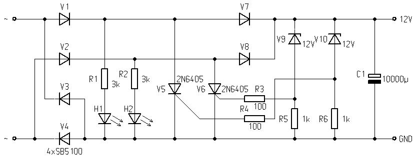 Die beiden Leuchtdioden könnte man auch weglassen, aber sie ermöglichen eine einfache Funktionskontrolle der Regelung: Ist die Spannung am Ausgang kleiner als 13,8 Volt, leuchten sie mit voller Helligkeit, da sie über die Dauer jeweils einer vollen Halbwelle mit Strom versorgt werden. Wird der Strom durch die Thyristoren herunter geregelt, leuchten sie dunkler, bis sie, wenn am Ausgang kein Strom mehr fließt, nur noch ganz schwach glimmen. In der Praxis sind die Spannungen der Z-Dioden V9 und V10 und die Zündströme der Thyristoren nie genau gleich. Bei abnehmender Belastung verlischt deshalb erst die eine und dann die andere.
