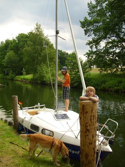 Ehe wir los fahren, legen wir noch den Mast auf die über Kreuz zusammen gebundenen Paddel, denn im Moment ist es noch windstill und uns steht eine längere Kanalfahrt bevor. Im Zotzensee legen wir noch eine Badepause ein, wieder mit Seilschlepp für die Kinder.