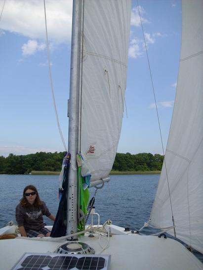Inzwischen bläst es ganz ordentlich, so das ich die Genua noch gegen die Fock tausche. Bei diesem Wind macht das Segeln richtig Spaß. Erst achterlicher Wind mit Schmetterling, später raumschots. In Böen erreichen wir fast 5 Knoten, sonst sind es zwischen 3 und 4. Zwei mal reffe ich sogar das Großsegel. Die meiste Zeit steuert Anna. Es bilden sich Wellen, die für die FAM allerdings noch kein Problem sind, früher mit unserer Jolle wäre es schon mehr als grenzwertig gewesen. Es ist schön, nach all den Schleusen und Brücken mal eine größere Strecke richtig zu segeln.