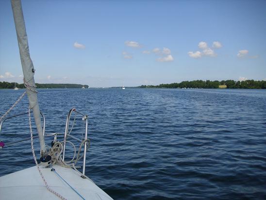 Das Kreuzen ist zwar anstrengend und mit unserem Wendewinkel auch langwierig, aber es mach auch Spaß, sich hier „ehrlich“ ohne Motorunterstützung hoch zu arbeiten. Wegen des Windes fahren wir die Schoten aus der Hand. Zuerst hält Anna lange Zeit die Vorschot, später wechseln sich die Kinder ab, weil sie schon nach kurzer Zeit Schot halten kaum mehr die Hände auseinander bekommen.