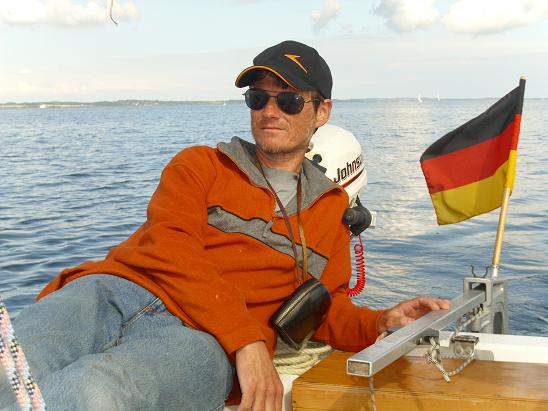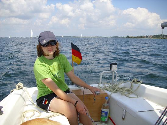 Dann geht es endlich los. Viel Wind ist nicht, aber wir segeln trotz dem. Anna sitzt an der Pinne. Ein Fischerboot ist mit uns auf Kollisionskurs. Anna fragt vorsichtshalber noch mal nach. Das Fischerboot fährt ohne Stundenglas. Der muss also ausweichen. Tut er aber nicht. Ich übernehme die Pinne und kann nun anhand eines praktischen Beispiels zeigen, was das Manöver des letzten Augenblicks ist. Als wir passieren, können wir sehen, dass das Steuer gar nicht besetzt ist.