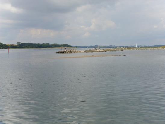 Halb zwei sind wir durch den Sund durch und setzen die Segel. Wir müssen kreuzen, der Wendewinkel ist mit der voll beladenen FAM miserabel, der Wind immer noch schwach. Letzteres ändert sich bald, der Wind wird stärker, so dass ich erst das Großsegel reffen und später sogar die Genua einrollen muss. Zum Wechsel auf die kleinere Fock bräuchte ich die Hilfe der Kinder, und da höre ich nur ein „öh, muss das sein?“. Na ja, lange hätte ich sie sowieso nicht stehen lassen können, dann wäre der Wind auch für die Fock zu stark. Das Kreuzen nur mit dem gerefften Groß geht fast besser als vorhin mit Genua und Groß bei schwachem Wind. Endlich umfahren wir die letzte Landspitze vor der Bucht die nach Dyvig führt, ein Fischer hat hier weit draußen noch eine Netzfahne platziert, was für uns einen Kreuzschlag mehr bedeutet. In die Bucht geht es nun mit schneller Fahrt mit Raumwind, leider ist die Bucht bald zu Ende, und die voraus fahrenden Boote holen vor der folgenden Engstelle alle ihre Segel ein. Obwohl es laut Wind und Karte ein Anlieger würde hole ich auch das Segel ein. Und das ist besser so, wer die Engstelle kennt, weis warum. Sie ist wirklich eng, aber gut mit Stangen gekennzeichnet.