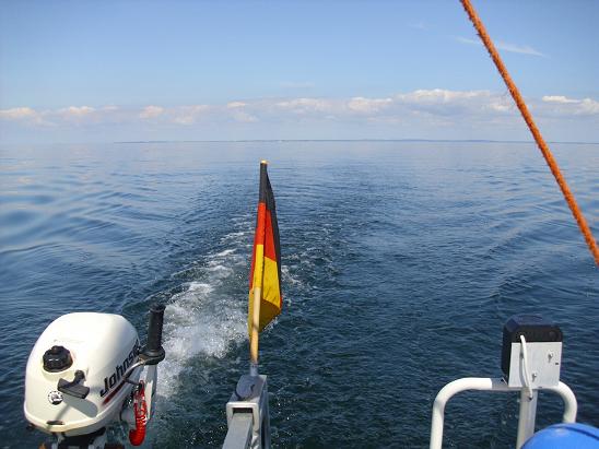 Bei Wind und Welle wäre es schon etwas aufregend gewesen, bei stärkerem Wind je nach Richtung vielleicht sogar unmöglich. Aber so ist es ganz gemütlich. Die Kinder haben sich alle eine bequeme Ecke gesucht und dösen. Selbst ich lege mich manchmal für ein paar Minuten hin, und schaue nur mit einem halben Auge auf den Kompass, um den Kurs zu halten. Der Motor brummt zufrieden mit Halbgas vor sich hin.