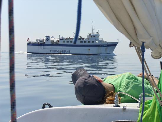 Kurz vor elf geht es los, unter Segel, Anna sitzt an der Pinne. Heute umfahren wir die Inseln nordwärts, dafür müssen wir durch die Durchfahrt zwischen den Inseln und Helnæs kreuzen. Dafür setze ich mich wieder ans Steuer. Man muss doch immer sehr zirkeln, wenn man mit der FAM Höhe machen will.