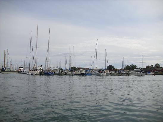 Im Fahrwasser ist viel Verkehr. Und der Hafen ist voll. An den Enden der Stege liegen schon dicke Päckchen. Aber dichter am Ufer wird das Wasser flacher, hier kommen die meisten Boote nicht mehr hin. Wir kurbeln das Schwert hoch und können uns sogar noch eine Box unter mehreren aussuchen.