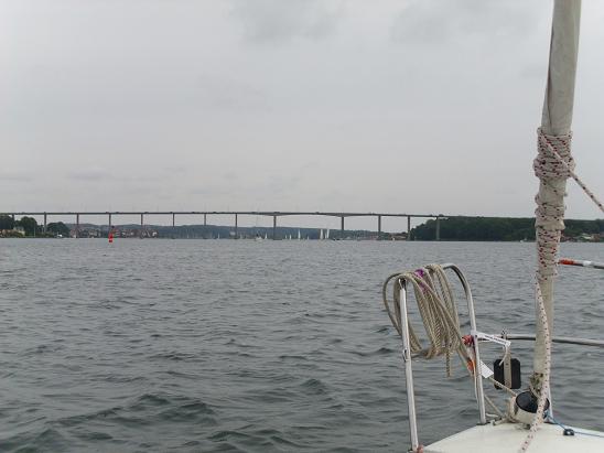 Für heute war kräftiger Wind angesagt, und das scheint sich zu bestätigen. Gleich nach der Hafenausfahrt machen wir den Motor aus. Heute wollen wir noch mal so richtig segeln. Der Wind kommt zwar genau aus Nordwest, also so ziemlich aus der Richtung, in die wir wollen, aber was soll’s. Vorerst geht es ja nach Süden, und da geht es so richtig vorwärts. Ausnahmsweise können wir mal ganz gut mit den anderen Booten mithalten, die hier sehr zahlreich vertreten sind. Der Wind frischt auf, auf schätzungsweise 5 Bft. Wir haben vorn die Fock und machen jetzt auch das Reff ins Großsegel. Dann geht es in den inneren Teil der Förde, und damit genau nach Nordwest.
