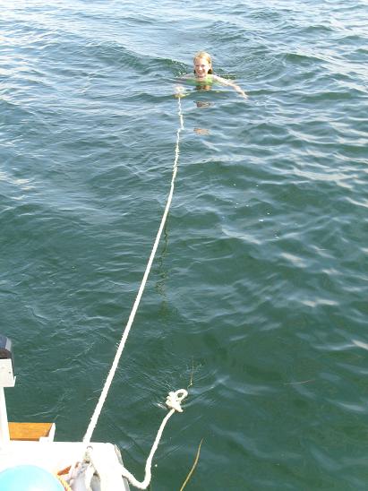 Zwischen Drejø und Skarø setzen auch wir die Segel. Der Wind ist allerdings so schwach, das wir für eine Badepause die Segel gar nicht runter nehmen müssen. Aber man verschätzt sich leicht: hinter dem Boot her schwimmen ist doch gar nicht so einfach.