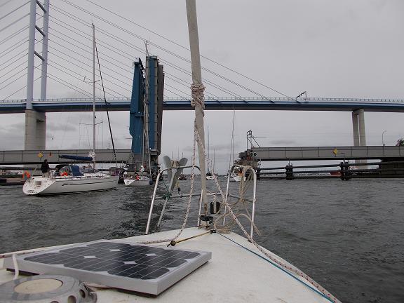 Die Brückenöffneung 16 Uhr 45 ist schon lange vorbei, als wir Wolgast erreichen. Aber wir haben jetzt Übung. Ohne auch nur das Gas wegzunehmen legen wir den Mast und fahren unter der Brücke durch.