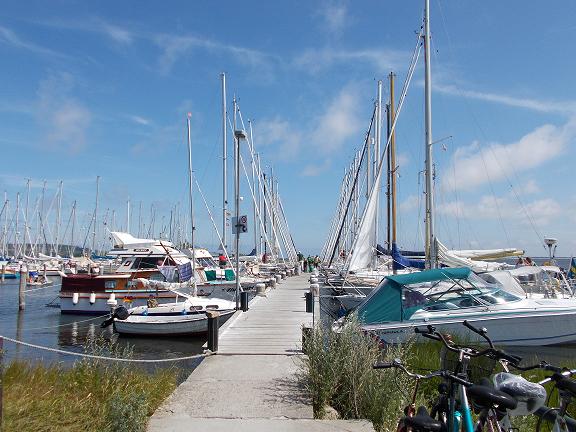 Der Hafen Vitte Lange Ort ist wie immer gerammelt voll, und im Fahrwasser nach Vitte kommen uns viele Yachten entgegen, die keinen Platz mehr gefunden haben. Teilweise liegen Boote zu dritt in zwei Boxen oder haben längsseits von außen an den Pfahlreihen festgemacht. Aber wohl dem, der ein Schwertboot hat: wie vor drei Jahren finden wir wieder einen Platz ganz innen halb im Schilf, wo es für die anderen schon zu flach ist, diesmal sogar noch mit richtiger Platznummer.