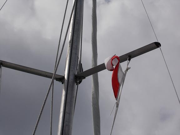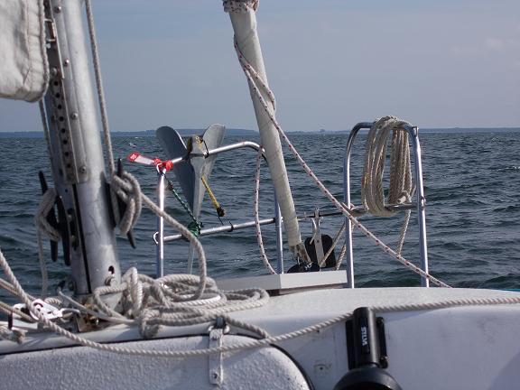 Der Wind zusammen mit der kurzen steilen Welle ist auf die Dauer etwas heftig. Ich lasse Ansgar die Fock wieder einrollen. Wegen des Windes kriegt er es nicht schnell genug auf die Reihe, die Fock wird sehr eng um das Vorstag gewickelt, das Achterliek knattert längere Zeit im Wind. Als das Segel endlich aufgerollt ist, ist das Achterliek auf einer Länge von etwa anderthalb Metern ausgerissen.