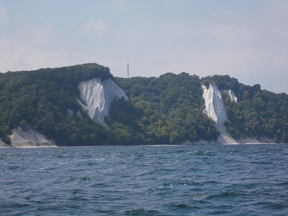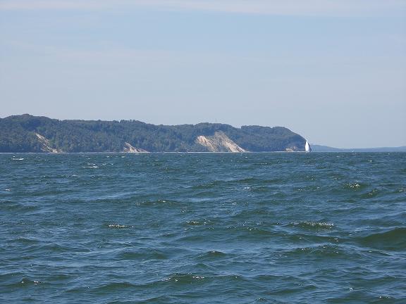 Nach Brötchenkauf beim Netto mit richtig langer Schlange und Frühstück geht es 10 Uhr 45 los. Ab hier ist die Strecke neu für uns, vor drei Jahren haben wir unsern Törn hier in Glowe beendet. Wind 3 aus West, ein halber Meter Welle, Ideal. Vorbei am viel gelobten Hafen Lohme, sollte man auch mal besuchen, vielleicht ein anderes Mal. Die Kreidefelsen kommen in Sicht. Schon beeindruckend vom Wasser aus. Wir halten allerdings Abstand, erstens ist das vorgeschrieben, zweitens wollen wir nicht in den Windschatten geraten. Ab hier ist reger Fahrgastschiffsverkehr mit Tagesausflüglern, die die Kreidefelsen besichtigen wollen.
