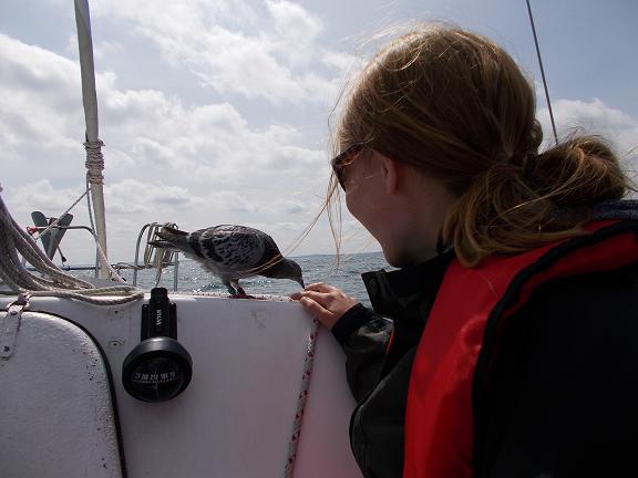 Eine Taube lässt sich auf unserem Vordeck nieder. Es soll ja manchmal vorkommen, das Vögel weit ab von der Küste erschöpft auf Schiffen landen, aber hier ist die Küste in Sichtweite, nur eine halbe Seemeile entfernt und besonders erschöpft sieht die Taube auch nicht aus. Die Brötchenkrümel, die wir ihr anbieten, möchte sie jedenfalls nicht obwohl sie sehr zutraulich ist.