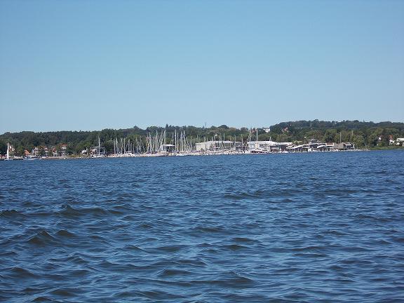 Heute ist unser letzter „Seetag“. Mit einer riesigen Armada von Optis und Zweimannjollen, die ich aus Unkenntnis nicht näher benennen kann, verlassen wir den Hafen. Unter Segel. Der Wind kommt aus West, und wenn wir heute noch einmal segeln können, dann hier. Der Wind ist allerdings nur schwach und bald ist totale Flaute. Der Segellehrer hat Mühe, seine Opti-Herde zusammen zu halten, die sich in alle nicht vorhandenen Winde zu zerstreuen droht. Erst als wirklich nichts mehr geht, nehmen wir den Motor. Ein drittes Mal fahren wir durch die Knaakrückenrinne, diesmal andersrum. Dann Abbiegen in Richtung West. Die Abstände zwischen den Bojen sind hier ziemlich groß. Also erst mal nach Kompass losfahren, irgendwann sieht man die nächsten Bojen schon. Aber die Einfahrt in den Strelasund ist ja auch so kaum zu verfehlen. Wir fädeln uns zwischen den Stahlbroder Fähren durch, die natürlich genau dann losfahren, als wir in ihrer Schusslinie sind und versuchen es ein letztes Mal mit Segeln. Eine Seemeile schaffen wir so in einer halben Stunde. Dann kommt endlich die Marina Neuhof in Sicht. Unter der Saling flattern drei Gastlandflaggen: Dänemark, Polen und Schweden.