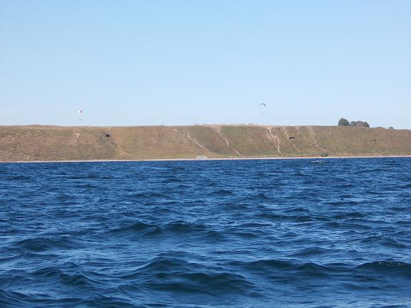 Was ich aus der Ferne noch für Kitesurfer gehalten hatte erweist sich nun als eine Unmenge von Gleitschirmen, die hier an der Küste soaren. Oben an der Kante steht etwas, das mich, obwohl ich noch nicht dort war, an Stonehenge erinnert.