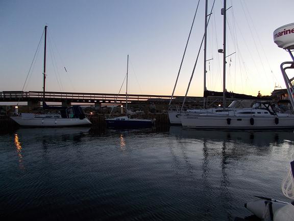20 Uhr 30 fahren wir in den Hafen ein. Die Gästeplätze sind gekennzeichnet, leider ist alles voll. Doch zwischen zwei Päckchen finden wir noch eine Lücke, wo wir längsseits an der Kaimauer fest machen können.