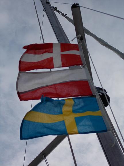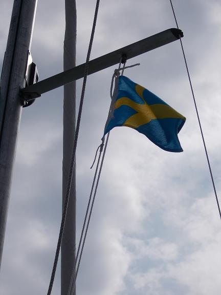 Die schwedische Küstenwache, die auf der anderen Seite auf- und abfährt, erinnert mich daran, das ich die Gastlandsflagge wechseln muss.