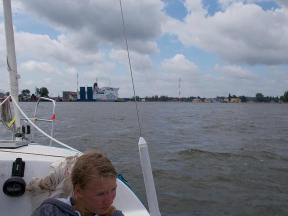 Swinemünde kommt in Sicht. Allerhand Verkehr hier. Ein Frachter schert plötzlich aus der Fahrrinne aus und fährt einen Vollkreis. Bis ich begreife, dass das ein Ankermanöver werden soll, vergeht eine Weile.