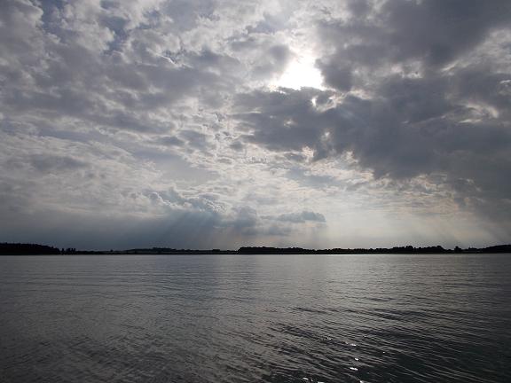 Das Boot macht wirklich gute Fahrt. Über 5 Knoten mit dem 2. Reff! Ansatzweise kommt es ins surfen. Den Kindern macht die Fahrt auch Spaß. „Besser als jede Achterbahn.“, so ihr Kommentar. Ab und zu schwappt eine Welle über den Rand, das kann man nicht verhindern. Mein Hintern ist nass, auch meine Arme und der Rücken. Ich hätte lieber das Regenzeug anziehen sollen.