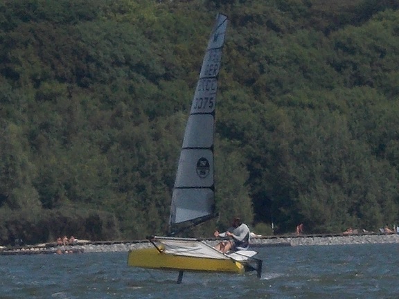 In einiger Entfernung sehen wir ein seltsames Segelboot. Bei höherer Geschwindigkeit hebt es sich aus dem Wasser und fährt scheinbar nur noch auf dem Kiel. Vielleicht eine Art Tragflächenboot. Auf jeden Fall eine recht kipplige Angelegenheit, denn beim Versuch eine Halse zu fahren, kentert es. Aber es ist auch relativ schnell wieder aufgerichtet.