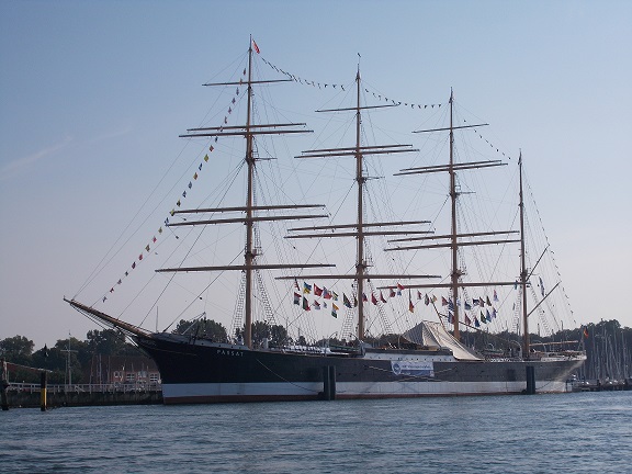 10 Uhr 40 legen wir bei strahlendem Sonnenschein ab, in den verwinkelten Fahrwassern wegen der Windrichtung streckenweise unter Motor, sonst unter Segel, auch wenn der Wind nur schwach ist. Später nimmt der Wind zu auf etwa Stärke 2 bis 3. Da unsere Geschwindigkeit gerade mal etwas über 3 Knoten beträgt brauchen wir für die 20 Seemeilen bis Travemünde eine ganze Menge Zeit. Die Kinder würden wegen der geringen Geschwindigkeit lieber mit Motor fahren um früher anzukommen, ich möchte lieber segeln. So ist es schon nach 18 Uhr, als wir endlich im Passathafen von Travemünde anlegen. Seltsam, dass ein Hafen nach einen dort liegendem Schiff benannt ist. Allerdings sieht es auch so aus, als hätte sich die Passat schon eine ganze Weile nicht mehr von hier fortbewegt. Um die Kinder mit der späten Ankunftszeit zu versöhnen gibt es Eis und heute auch mal Pizza in der Gaststätte am Hafen.