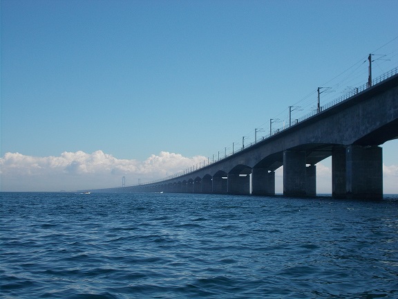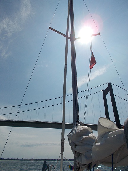 Nach Brötchenkauf und Verzehr derselben ist es 11:10 Uhr, als wir in Nyborg ablegen. Bis Kerteminde, unserem heutigen Ziel, ist es eigentlich gar nicht weit. Aber wir müssen erst eine ganze Strecke in Richtung Ost fahren, weil die westlichsten Brückendurchfahrten zu niedrig für unseren Mast sind. Und nach dem wir letztes Jahr an der Rügendammbrücke unseren Verklicker verbogen haben, fahre ich lieber noch ein paar Durchfahrten weiter, als unbedingt nötig. Schon beeindruckend, unter dieser Brücke durch zu segeln, genau genommen sind es sogar zwei Brücken, eine für die Straße und eine für die Eisenbahn.