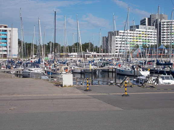 Im Hafen ist es durch die Hochhäuser herrlich ruhig und bald scheint auch wieder die Sonne. Wir gehen einkaufen, ein EDEKA ist hier keine 50 Meter vom Wasser entfernt. Anschließend essen wir noch Eis und später Backfisch mit Pommes, das Kochen sparen wir uns heute.