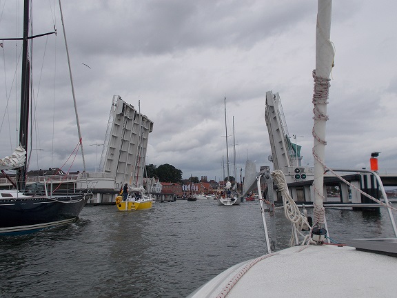 Um 11:45 Uhr geht die Klappbrücke auf und wir fahren weiter. Da kein Wind ist, immer noch unter Motor.