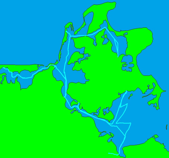 Ziel für heute ist Ralswiek. Der Wind ist etwas schwächer als gestern und er kommt immer noch aus West, für uns also ideal. Noch im Fahrwasser von Vitte setzen wir das Großsegel, heute nur noch im 1. Reff. Später nehmen wir noch die ausgebaumte Fock hinzu. Im Gegensatz zu gestern ist das Segeln heute richtig angenehm. Bald ist Breege erreicht, hier waren wir schon mal, 8 Jahre ist das her. Nach dem Abzweig nach Breege ist es nicht mehr weit, bis das Fahrwasser rechtwinklig abbiegt in den Großen Jasmunder Bodden. Ab hier ist es Neuland für uns. Nach einigen Tonnenpaaren hört die Fahrwassermarkierung plötzlich auf. Erst wundere ich mich, aber ein Blick in die Karte bestätigt es. Ab hier gibt es nur noch zwei Ansteuerungstonnen in größerem Abstand, weil der Bodden überall ausreichend tief ist. Trotz Anpeilen mit dem Kompass und Fernglas sind die Tonnen schwierig zu finden, weil sie sich mit ihrer Schattenseite kaum vor dem Landhintergrund abheben.