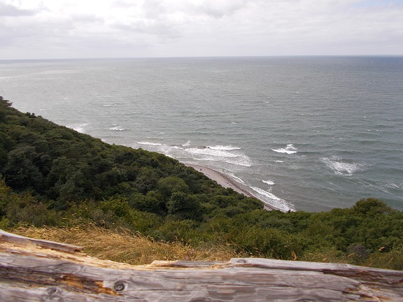 Zurück geht es am Klausner vorbei, mit Rücksicht auf Dina diesmal nicht die Treppe runter zum Strand, sondern oben entlang, den Hochuferweg. Sehr schön ist hier das terrassenartige Abrutschen des Steilufers zu sehen.