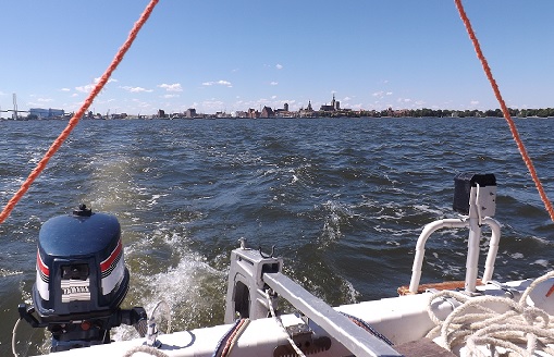 Dank Brötchenservice kommen wir heute schon kurz nach 10 Uhr los. Da uns der Wind entgegen kommt, unter Motor. Heute wollen wir nur bis Stralsund. Das sind 6 Seemeilen. Aber nach meinen bisherigen Erfahrungen sollte man zeitig ankommen, um einen der wenigen freien Liegeplätze zu ergattern. Der Vorteil des aufholbaren Schwertes bringt hier nichts, da es nur Liegeplätze mit ausreichendem Tiefgang gibt.