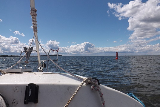 Nach der Ansteuertonne Greifswald fahren wir einfach weiter geradeaus, und können nach einer Weile sogar das Reff rauslassen. Wir dürfen nur dem Stubber, einer Untiefe, die sich mitten auf dem Greifswalder Bodden befindet, nicht zu nahe kommen. Aber noch ist der meilenweit entfernt.