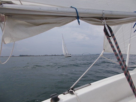 Da wir nach Timmendorf wollen, müssen wir erst an der Insel vorbeifahren und dann dem Fahrwasser folgend nach links abbiegen. Ich versuche schon mal den Großbaum von Backbord nach Steuerbord zu shiften, aber es gelingt mir nicht, der Winddruck ist zu stark. Ich überlege schon, eine Q-Wende zu fahren, aber es kommt mir doch komisch vor, dass ich den Großbaum nicht von Hand rüber kriege. Dann entdecke ich des Rätsels Lösung: Ich habe die Reffleine des 2. Reffs außen um das Want geführt, ich hatte mich beim Reffen schon gewundert, dass es so schwer ging. Man muss es nur richtig machen, nun geht alles ganz leicht.