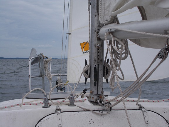 Später frischt der Wind etwas auf und wir können auf den Motor verzichten. Weit voraus tauchen die ersten Gebäude von Warnemünde auf. Plötzlich knallt es in der Takelage. Nach einem ersten Schreck stelle ich fest, dass das Boot ungerührt weiter segelt. Die Blöcke der Großschot liegen auf dem Cockpitboden, der Großbaum, der ohnehin weit ausgestellt war, hat sich an das Want gelegt. Der Wirbel, mit dem der obere Schotblock am Baum befestigt war, ist gebrochen. Einfach so. Naja, nicht ganz einfach so: So wie er verbogen ist, ist er vermutlich irgendwie verkantet unter Last gekommen. Jedenfalls gut, dass es in einer so harmlosen Situation passiert ist. Ich ersetze den Wirbel durch einen Schäkel. Die Schot ist jetzt fast uneingeschränkt weiter nutzbar. Wie war das? Lichtleiste, Kompass, Verklicker und jetzt der Wirbel…