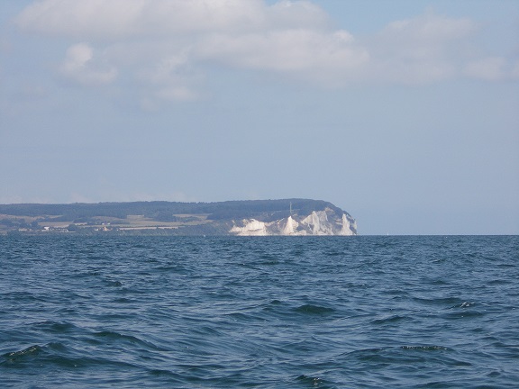 40 Seemeilen sind es bis Vitte, deshalb fahren wir schon gegen 8:45 Uhr los. Der Wind kommt mit Stärke 3 aus West, wie vorhergesagt, optimal. Mit 3 bis 4 Knoten geht es schnell voran. An Backbord achteraus sind jetzt auch die Kreidefelsen zu sehen. Ich habe sie schon mal gesehen, als Kind, das ist lange her. Wir waren auf dem Campingplatz am Bakenberg, im Norden von Rügen. Eines Abends war von der Steilküste aus im Nordwesten Land zu sehen. Es war so eine Art Luftspiegelung, es reichte, einige Meter zur Seite zu gehen, schon sah man nichts mehr. Das Schauspiel wiederholte sich mehrere Abende hintereinander. Und irgendjemand meinte, das müsse Møn sein, das läge in dieser Richtung.