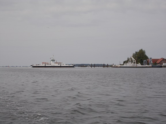 Es geht an der Wittower Fähre vorbei. Früher, wenn wir am Bakenberg gezeltet haben, sind wir oft damit gefahren. Das Fährschiff ist jetzt natürlich ein anderes. Auf der Fähre damals lag in der Mitte noch das Gleis der Schmalspurbahn nach Altenkirchen. Da habe ich mich als Kind darüber gewundert, da es die Bahn auch damals schon nicht mehr gab. An das alte Schiff erinnern nur noch die alten trichterförmigen Anlegestellen.
